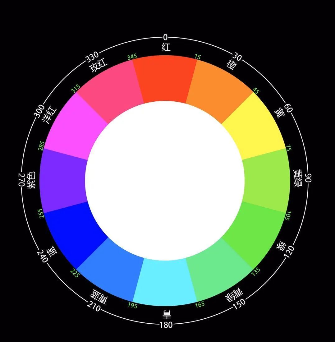 除了黑、白、灰三種無彩色,任何色彩都有色相。設(shè)計常用到的色相環(huán)就是最直觀的表達(dá)。